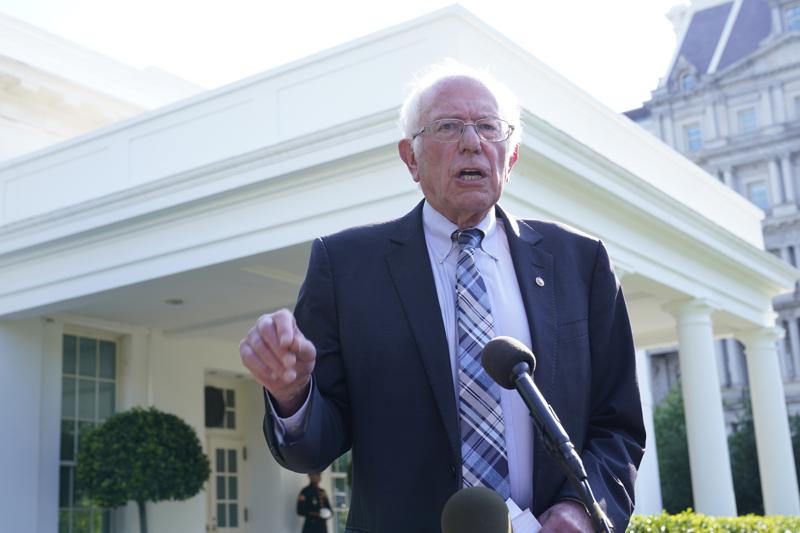 Sen. Bernie Sanders, I-Vt., talks to reporters outside the West Wing of the White House in Washington, Monday, July 12, 2021, following his meeting with President Joe Biden. (AP Photo/Susan Walsh)