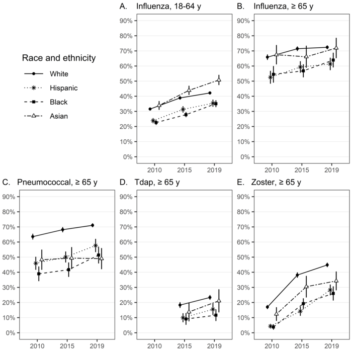 The current study shows that racial and ethnic disparities in vaccine uptake (including influenza, pneumococcal, shingles, and Tdap vaccinations) have persisted over the last decade in adults. Black and Hispanic individuals had lower uptake of vaccination than White individuals. Socioeconomic disparities in influenza vaccine uptake have moderately narrowed among adults 18–64 years of age between 2010 and 2019, possibly because of the Affordable Care Act. However, socioeconomic disparities in vaccine uptake have persisted among adults 65 years of age and older.
