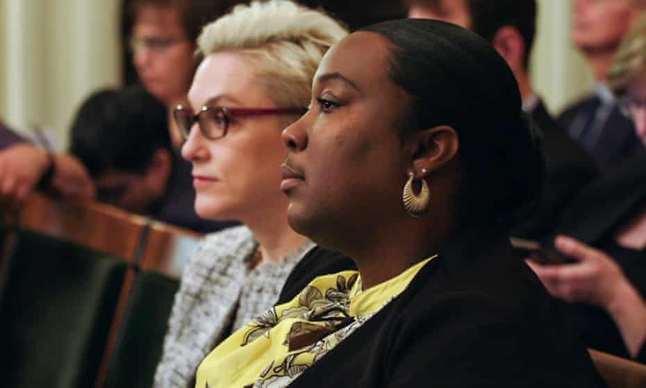 Kelli Dillon testifies. Dillon was forcibly sterilized as an inmate in a California prison. Photograph: Courtesy of Belly of the Beast
