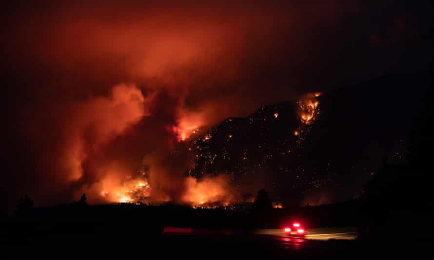A motorist travels on the Trans-Canada Highway as a wildfire burns on the side of a mountain in Lytton, British Columbia, on Thursday. Photograph: Canadian Press/REX/Shutterstock