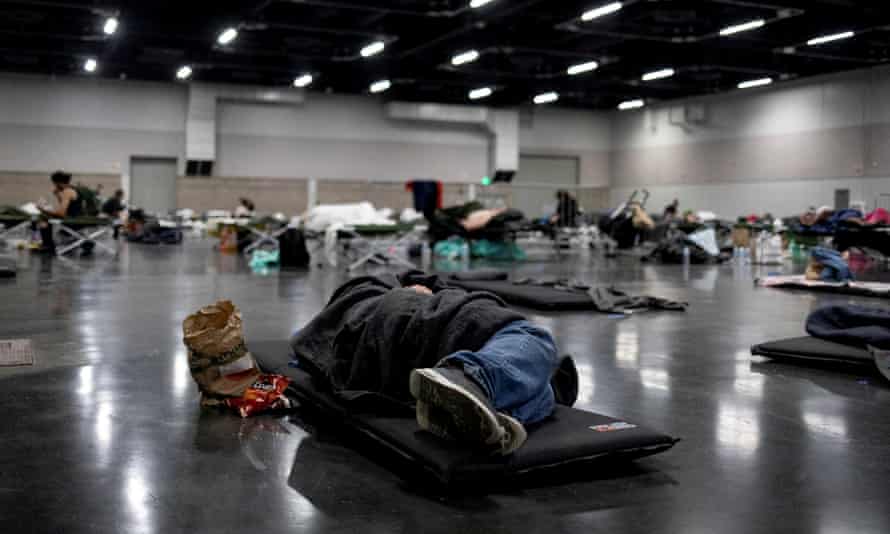 A man sleeps at a cooling shelter set up in Portland, Oregon, on Sunday. Photograph: Maranie Staab/Reuters