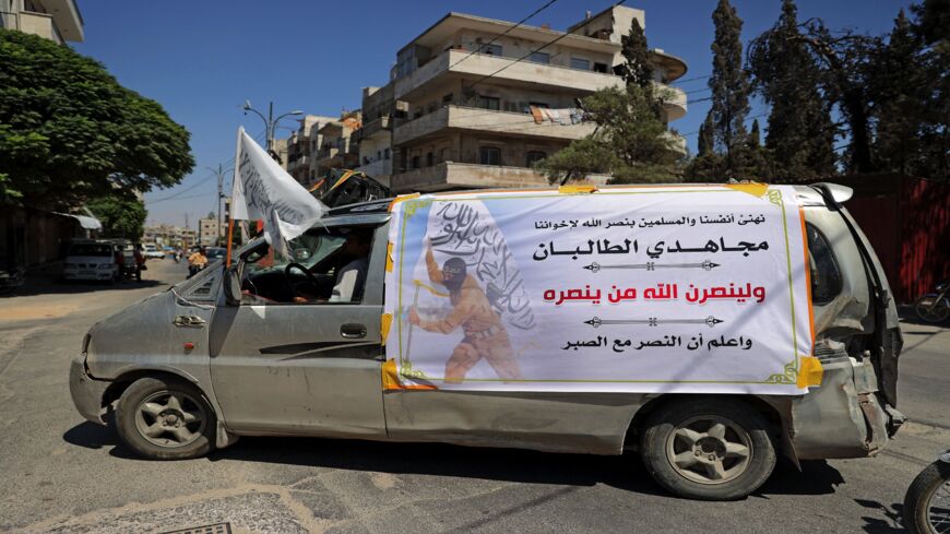 A van belonging to members of Syria's top jihadi group, Hayat Tahrir al-Sham (HTS), led by al-Qaeda's former Syria affiliate drives with a banner congratulating the Taliban on their takeover of Afghanistan during a parade through the rebel-held northwestern city of Idlib on Aug. 20, 2021. - OMAR HAJ KADOUR/AFP via Getty Images