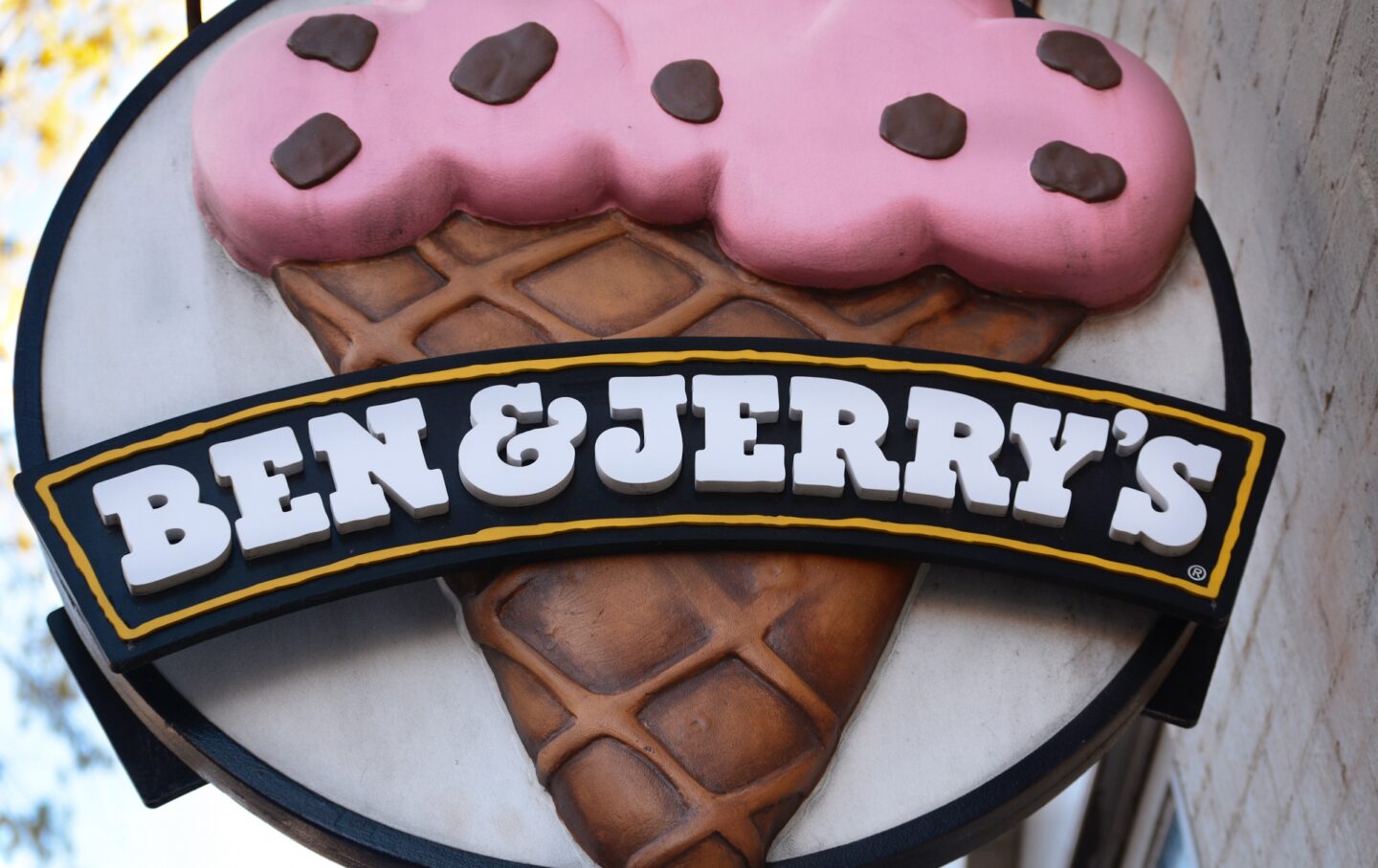 A business sign hangs over the entrance to a Ben & Jerry’s ice cream shop. (Robert Alexander / Getty Images)