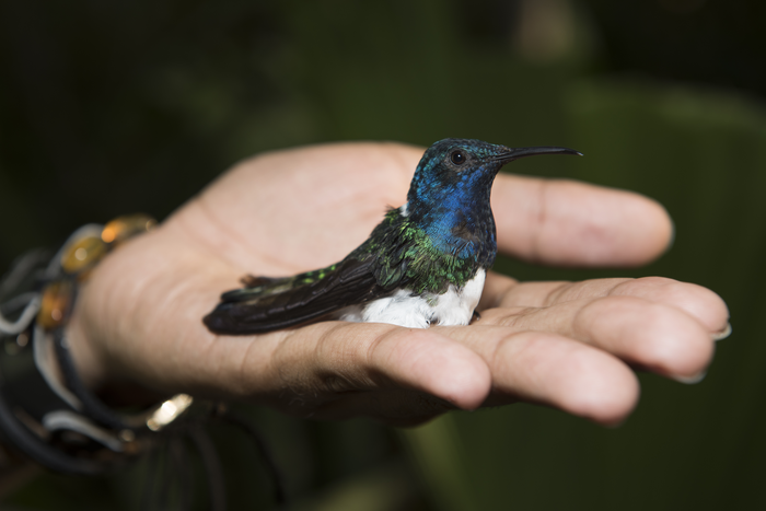 IMAGE: THIS IMAGE SHOWS A MALE-LIKE FEMALE WHITE-NECKED JACOBIN HUMMINGBIRD BEING RELEASED AFTER CAPTURE AND TAGGING. view more