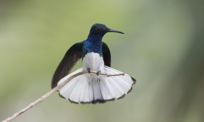 Both male and female White-necked Jacobins fan their tails during courtship or aggressive interactions. Because this bird also has its wings partially raised it's likely an aggressive stance.