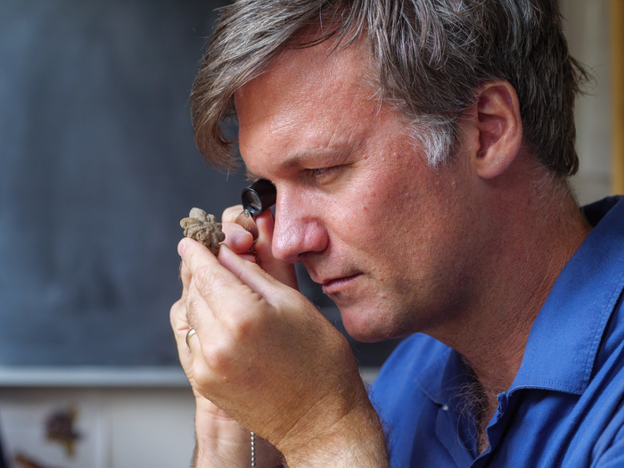 IMAGE: CARL SIMPSON INSPECTS A FOSSIL OF BROOKSELLA ALTERNATA, AN INVERTEBRATE ANIMAL THAT SWAM IN THE OCEAN ROUGHLY 500 MILLION YEARS AGO. view more