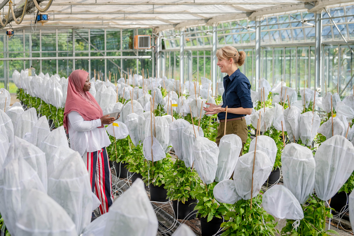 IMAGE: PROF. BRIGITTE POPPENBERGER (R.) AND HER DOCTORAL STUDENT, ADEBIMPE ADEDEJI-BADMUS, SURROUNDED BY EBOLO PLANTS IN A GREENHOUSE OF THE TUM SCHOOL OF LIFE SCIENCES. view more
