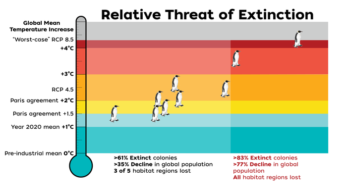 Extreme events, as observed through the satellite records, amplify the projected declines by previous studies. If greenhouse gas emissions continue to rise at levels similar to today—causing temperatures to rise and Antarctic Sea ice to shrink—penguin population numbers will diminish slowly until about 2040, after which they would decline at a much steeper rate as sea ice coverage drops below a usable threshold, with the species being quasi -extinct as 98% colonies will have disappeared by 2100.