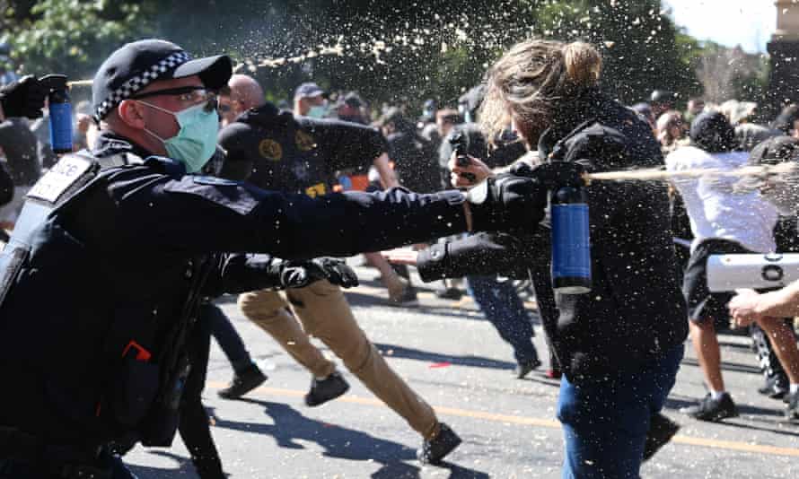Victoria police were pelted with projectiles, punched and kicked by some members of a 4,000 strong crowd who turned out to protest Melbourne’s Covid lockdown. Photograph: Dave Hewison/Speed Media/REX/Shutterstock