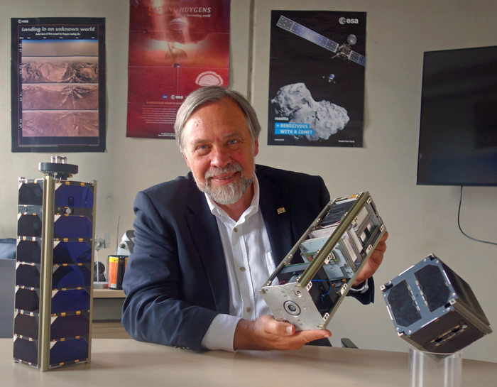 IMAGE: KLAUS SCHILLING WITH THE SATELLITES THAT HAVE ACCOMPANIED HIS PROFESSIONAL LIFE. UWE AND NETSAT IN THE FOREGROUND; ON THE POSTERS IN THE BACKGROUND HUYGENS AND ROSETTA, WHICH WERE REALISED DURING HIS WORK IN INDUSTRY. view more