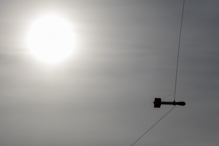 Geophysical measurements with a magnetometer being towed with RV Polarstern's board helicopter.