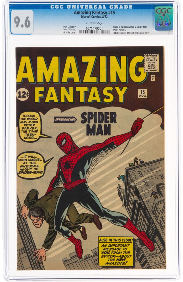 The finest-known copy of Amazing Fantasy No. 15 sold for $3.6 million on 9 September 2021 at Heritage Auctions during the third session of the Sept. 8-12 Comics & Comic Art Signature Auction. Graded CGC Near Mint+ 9.6, the 1962 Marvel comic is one of only four copies ever to receive such a high grade, and there is not a single known copy in better condition.