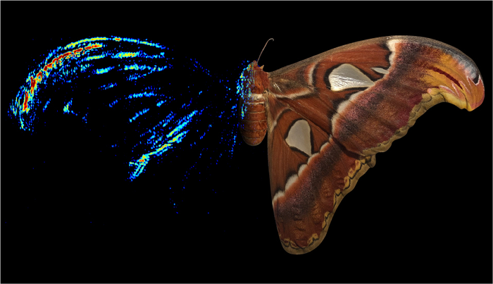 IMAGE: THE ATLAS MOTH (ATTACUS ATLAS) HAS A STRONG ANTI-BAT ACOUSTIC DECOY AT THE TIP OF ITS FOREWINGS. COMPOSITE IMAGE WITH PHOTOGRAPH ON RIGHT HALF AND ACOUSTIC TOMOGRAPHY ON THE LEFT. COLOUR INDICATES ECHO STRENGTH ON A DB SCALE AND RED INDICATES HIGHEST ECHO AMPLITUDE. NOTE THE RED HIGHLY REFLECTING STRIPE CREATED BY THE RIPPLED PART OF THE WINGTIP. view more