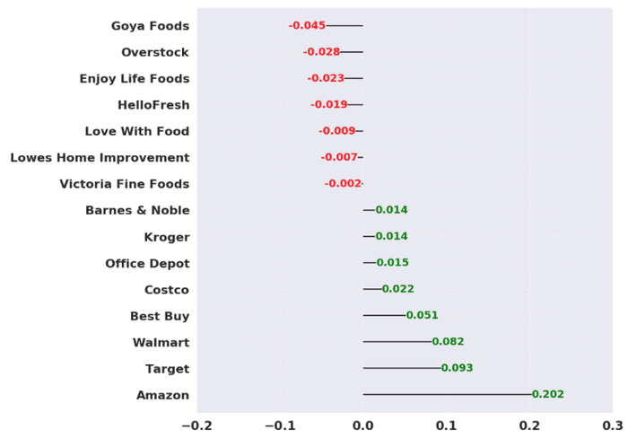 “For example,” explains Zhang, “consider Amazon’s acquisition of Whole Foods. In the chart below, the green lines show that Whole Foods’ proximity to other retail brands such as Target and Walmart increases, while the red lines shows its proximity to supermarket brands such as Goya Foods and HelloFresh decreases.”
