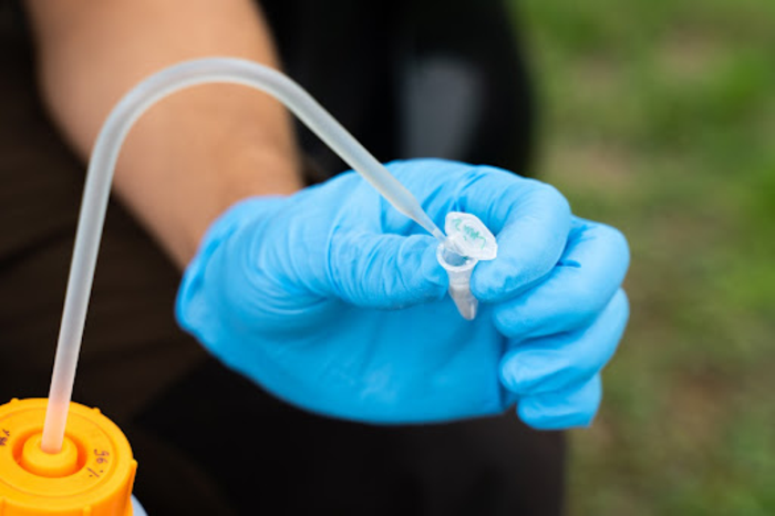 After water filtration the eDNA filter is preserved in ethanol until further processing in the lab.