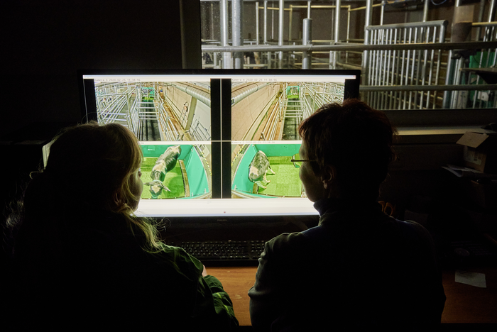 Observers watch calves undergo MooLoo toilet training.