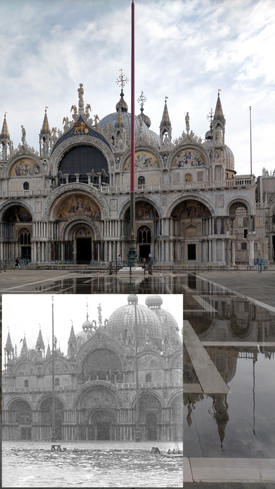 IMAGE: PRESENT CONDITION OF ST.MARK'S SQUARE DURING PARTIAL FLOODING OF ITS LOWEST AREAS (ESTIMATED SEA LEVEL: 80CM) AND HISTORICAL PICTURE CLOSE TO THE TIME OF HIGHEST WATER ON THE 4 NOVEMBER 1966 FLOOD (BLACK AND WHITE PHOTO COURTESY OF GIANFRANCO TAGLIAPIETRA) view more