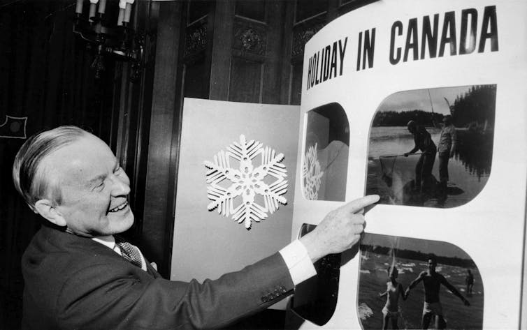 Prime Minister Lester B. Pearson admires a poster promoting Canadian tourism in 1964. (CP PHOTO)