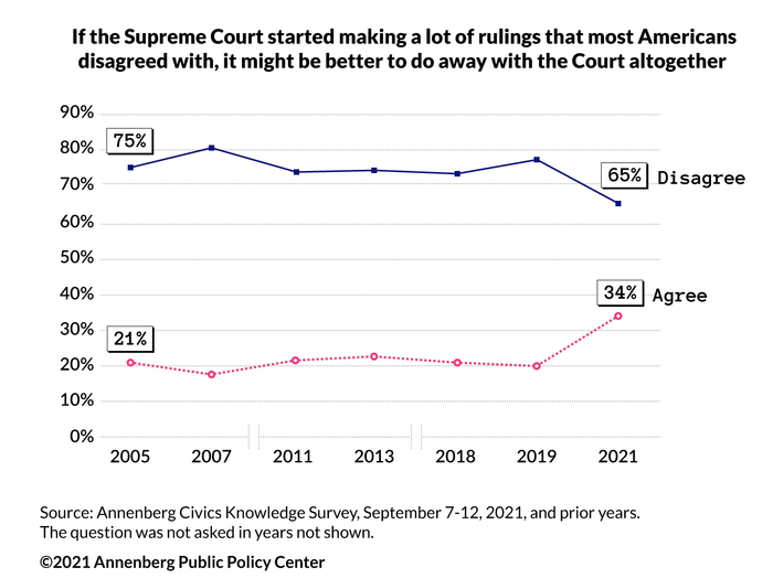IMAGE: SURVEY SHOWING THE RESPONSE (AGREE/DISAGREE) TO THE STATEMENT: "IF THE SUPREME COURT STARTED MAKING A LOT OF RULINGS THAT MOST AMERICANS DISAGREED WITH, IT MIGHT BE BETTER TO DO AWAY WITH THE COURT ALTOGETHER." SOURCE: ANNENBERG CIVICS KNOWLEDGE SURVEY, SEPT. 7-12, 2021, AND PRIOR YEARS. view more