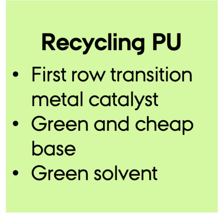 In an effort to reduce our plastic footprint and dependency on fossil fuels a change from the current linear model (make-use-dispose) towards a circular plastic economy, where PU is produced, used, recovered and recycled into new PU-materials is needed. The usage of an earth-abundant metal, a green solvent and the potential adaption towards green hydrogen could pave the way towards a circular plastic economy for PU.