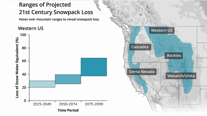 “A recent study highlighted that there has been a 21% decline in the April 1 snowpack water storage in the western U.S. since the 1950s – that’s equivalent to Lake Mead’s storage capacity. In our review, we found that around mid-century we should expect a comparable decline in snowpack,” said Rhoades. “By the end of the century, the decline could reach more than 50%, but with a larger range of uncertainty.”