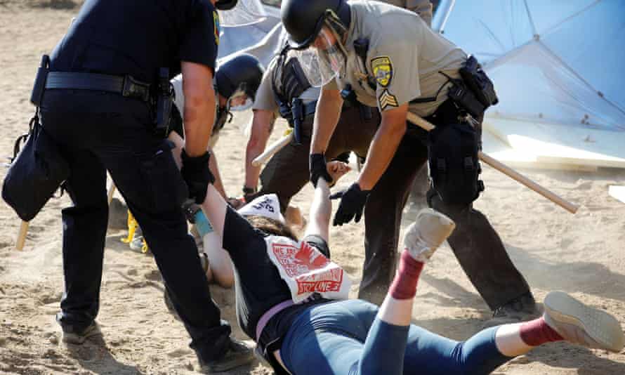 Police officers drag a demonstrator who was protesting at an Enbridge pump station construction site in Hubbard county, Minnesota, in June. Photograph: Nicholas Pfosi/Reuters