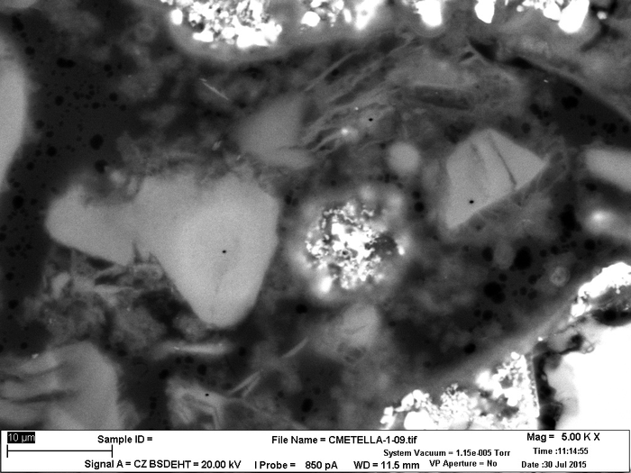 Peer-Reviewed PublicationIMAGE: SCANNING ELECTRON MICROSCOPE IMAGE OF THE TOMB MORTAR. THE INTACT AND WISPY C-A-S-H FEATURES APPEAR AS GRAY, WHILE THE VOLCANIC AGGREGATE APPEARS AS WHITE. view more