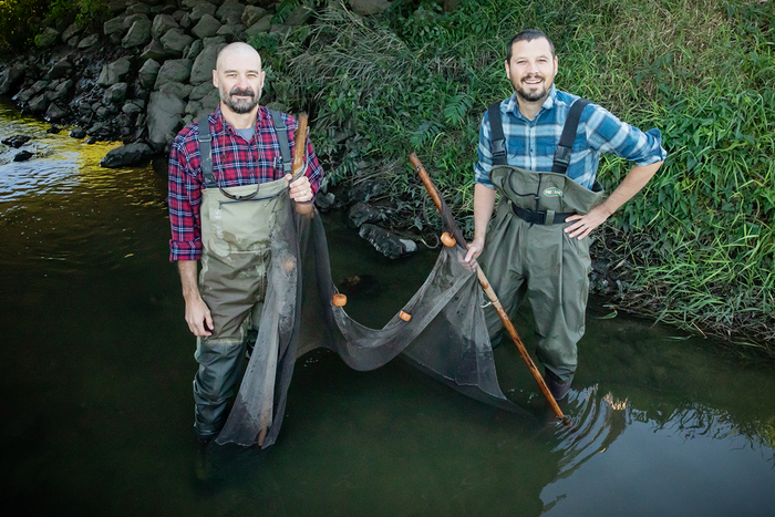 IMAGE: CHRISTOPHER TAYLOR, LEFT, ERIC LARSON AND THEIR COLLEAGUE ZACHARY ROZANSKY, NOT PICTURED, REPORT THAT AN INVASIVE CRAYFISH IS INTERBREEDING WITH A NATIVE SPECIES IN THE CURRENT RIVER IN MISSOURI. view more