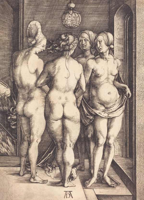That stress on the allure and attraction of witches is even more explicit in the work of the great German Renaissance artist Albrecht Dürer. In 1497, Dürer made The Four Witches, an engraving that depicts fleshy nudes dancing in a round. They are delineated with a boldness he learned on a trip across the Alps to Venice. There he encountered not just the city’s sex workers who also worked as artist’s models, but the new classically influenced Italian art with its cult of the human body. But Dürer’s own desires make him anxious. Even as he draws these women naked – as if picturing respectable Nuremberg frauen with their clothes off – he seems to sense they are witches. At the back of the room, an open door reveals the devil, his fanged mouth hanging open as he watches his minions from a cellar that has become a portal of hell.