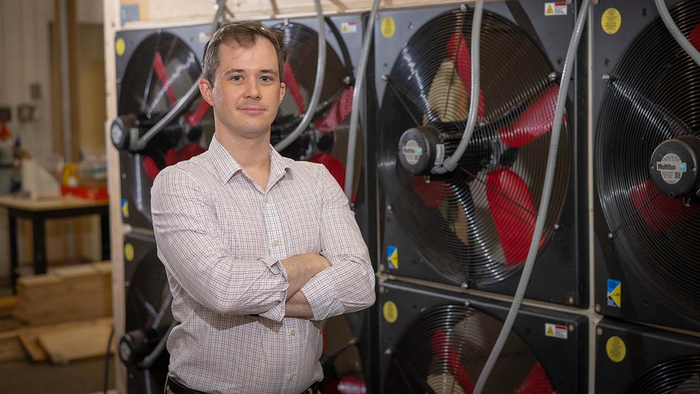 IMAGE: FIRE RESEARCHER JAMES URBAN IN HIS LABORATORY AT WORCESTER POLYTECHNIC INSTITUTE. view more