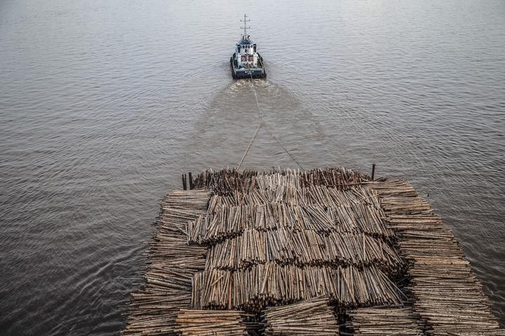 A barge carrying logs is pulled along the Mahakam River, in East Kalimantan, 4 November 2021. Photo: AFP
