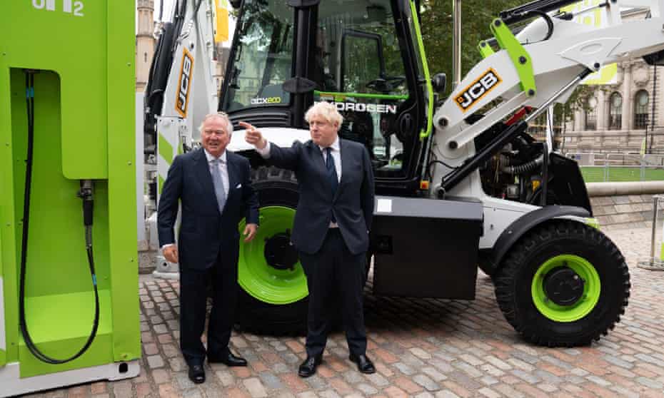 Boris Johnson and JCB chairman Lord Bamford unveil a hydrogen-powered JCB in October 2021. Photograph: Stefan Rousseau/PA
