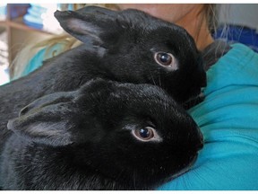 These two domestic rabbits are being fostered by Katryna Patterson, a volunteer with Infinite Woofs Animal Rescue Society, until they are adopted.