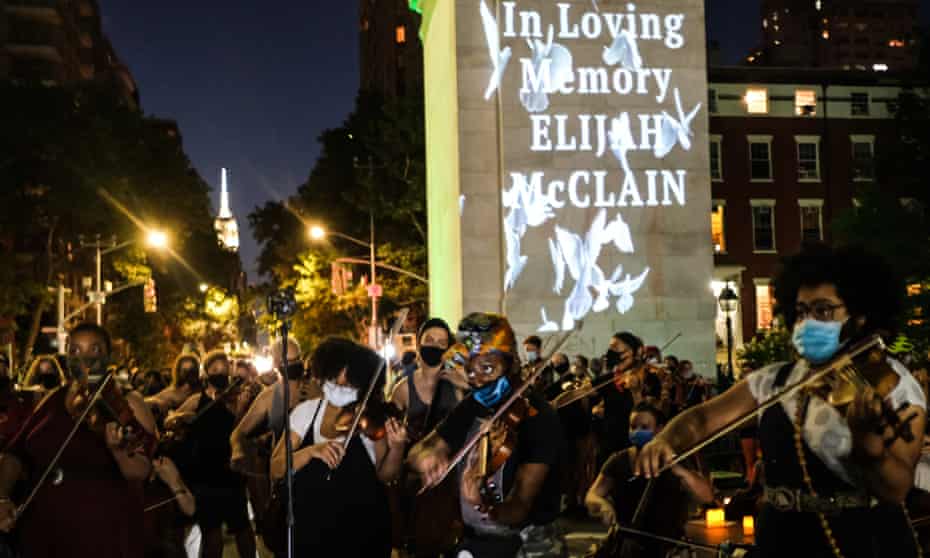 String players perform during a vigil for Elijah McClain in New York City. McClain played the violin. Photograph: Byron Smith/Getty Images