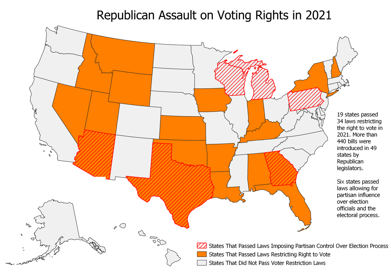 Fueled by the false claims of Trump and leading Republicans that the 2020 election was fraudulent, Republican law makers have introduced a barrage of restrictive voting bills. Throughout 2021 there were at least 440 restrictive bills introduced in 49 states. Of those, 34 were signed into law in 19 states.