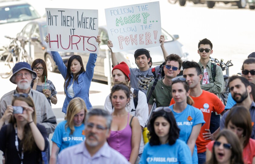 A rally in support of fossil-fuel divestment outside San Francisco City Hall in 2013.