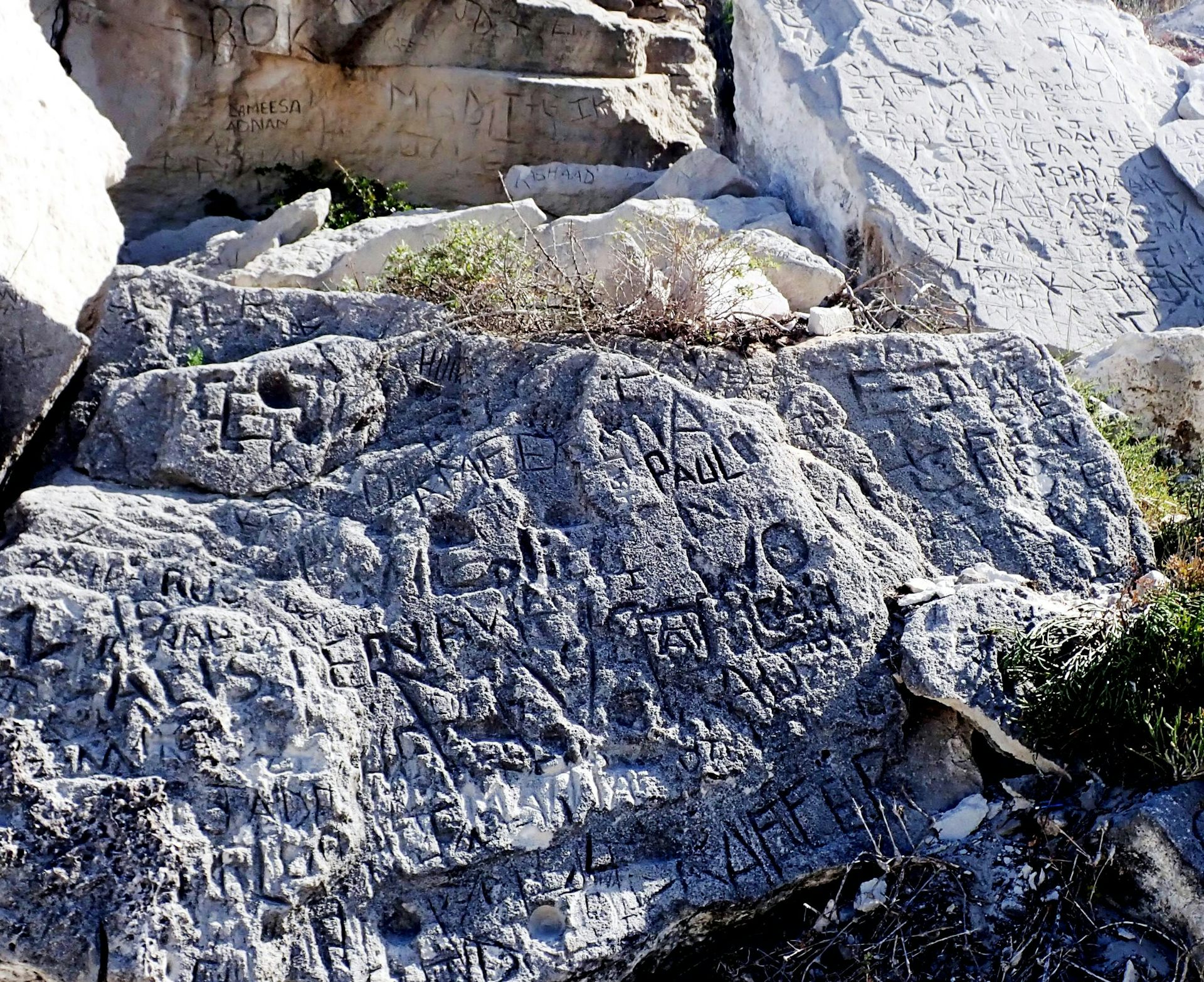 Graffiti in aeolianites at Langebaan. Some potential human tracks have been destroyed by such graffiti.