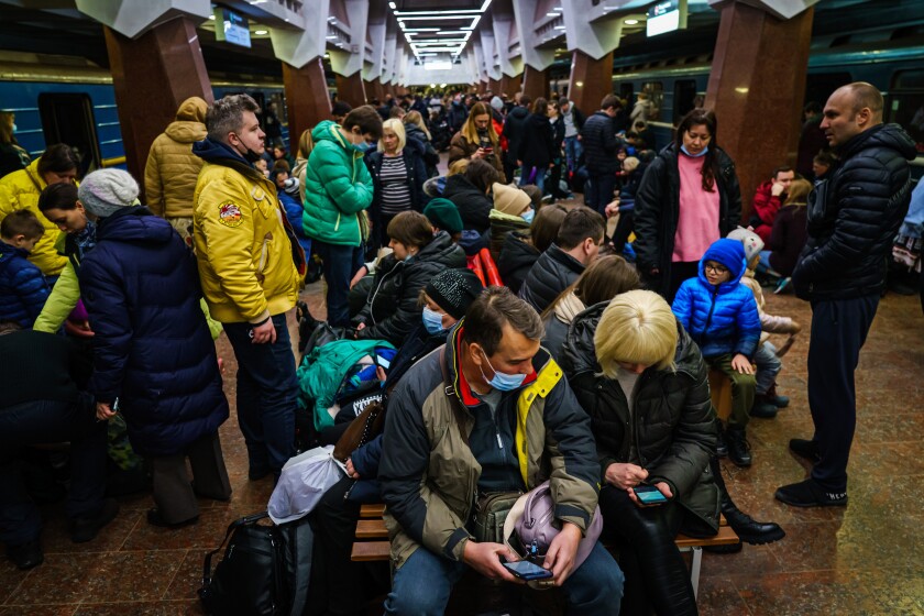 Hundreds of people sought shelter in an underground train station in Kharkiv, Ukraine, as the Russian invasion continued Thursday.