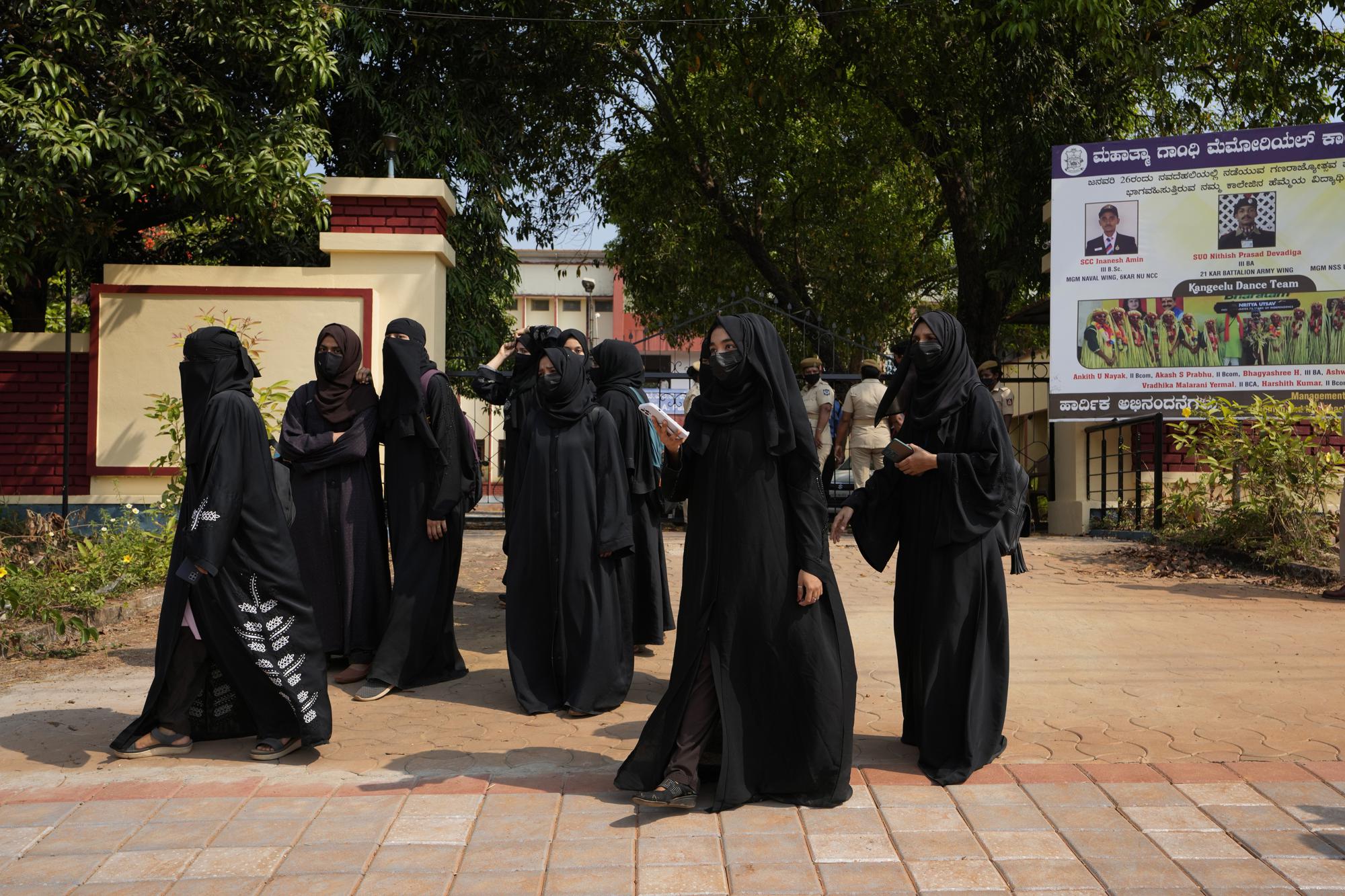 Indian Muslim students wearing burqas leave Mahatma Gandhi Memorial college after they were denied entry into the campus in Udupi, Karnataka state, India, Feb. 24, 2022. (AP Photo/Aijaz Rahi)