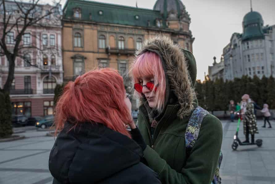Alice, 24, a trans woman from Brovary, a town near Kyiv with her wife, Helen, a 21-year-old non-binary person, in Lviv. Photograph: Alessio Mamo/The Guardian