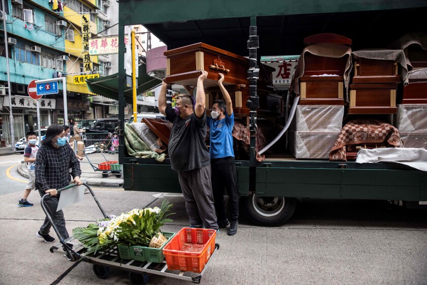 Empty coffins are delivered to funeral businesses in the Kowloon district of Hong Kong on Thursday.