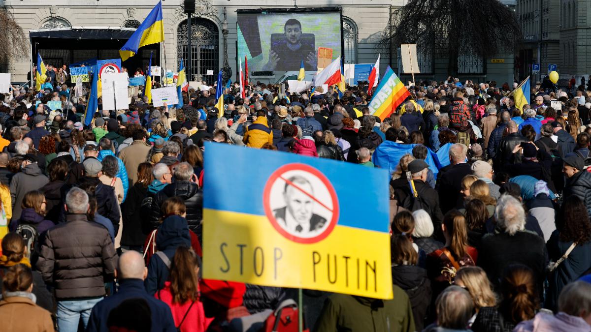 President Volodymyr Zelensky is displayed on a screen during a demonstration against the Russian invasion of Ukraine. (AP photo)