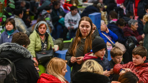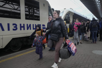 Parents accompany children and teenagers as they board a train after leaving Kyiv’s Central Children’s Hospital, following its evacuation.CREDIT:AP PHOTO