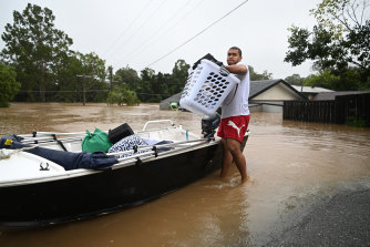 A man carries his belongings as people evacuate homes inundated by floodwater at Goodna in Brisbane’s west. CREDIT:GETTY