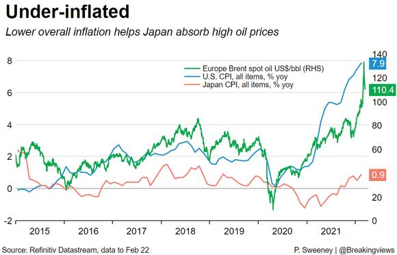 Yet while official data showed energy prices popped 20.5% in February, overall consumer price inflation was a tepid 0.9% year-on-year. In fact Japan, by dint of its aging society and investments in efficiency, has become less energy-intense when it comes to driving growth, which is forecast to hit nearly 3% in the current fiscal year. It won’t feel a serious pinch from oil until prices exceed $150 per barrel, according to an analysis by HSBC. Equity investors aren’t panicking; the Topix index is down only 4% in 2022.
