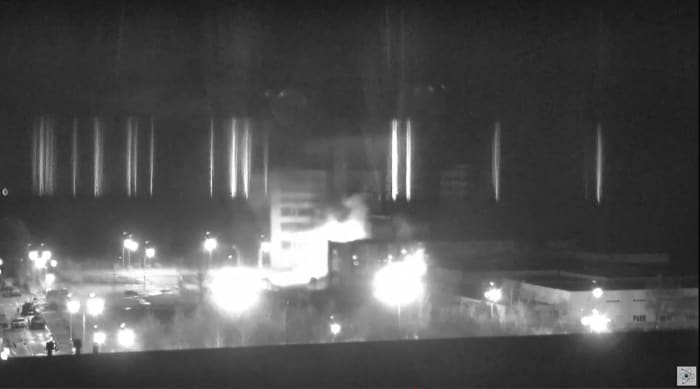 A still frame from livestreamed video on March 4 from the Zaporizhzhia Nuclear Authority showing explosions amid Russian shelling of the complex.