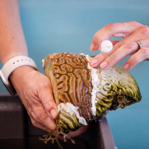 Antibiotic paste is applied to corals at risk from SCTLD at the University of the Virgin Islands in St Thomas.