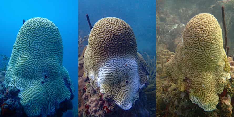 Composite showing the advance of SCTLD in a single coral colony of the Meandrina meandrites species off Puerto Rico. From left: healthy, diseased and dead coral. Photograph: Catalina Morales