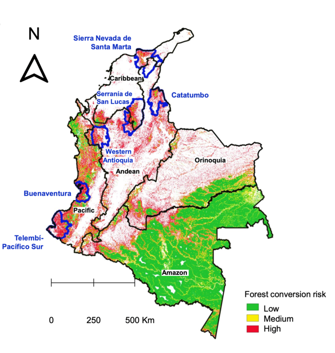 They found that the Andean region contains the highest mean OCC, reflecting a very strong probability of agricultural conversion of the remaining forests. Following closely behind were the Pacific, the Caribbean and the OrinoquĂa regions. The Amazon region, the one with the lowest mean probability of agricultural conversion, had the greatest forest cover percentage and the greatest forest area, had a much lower OCC.