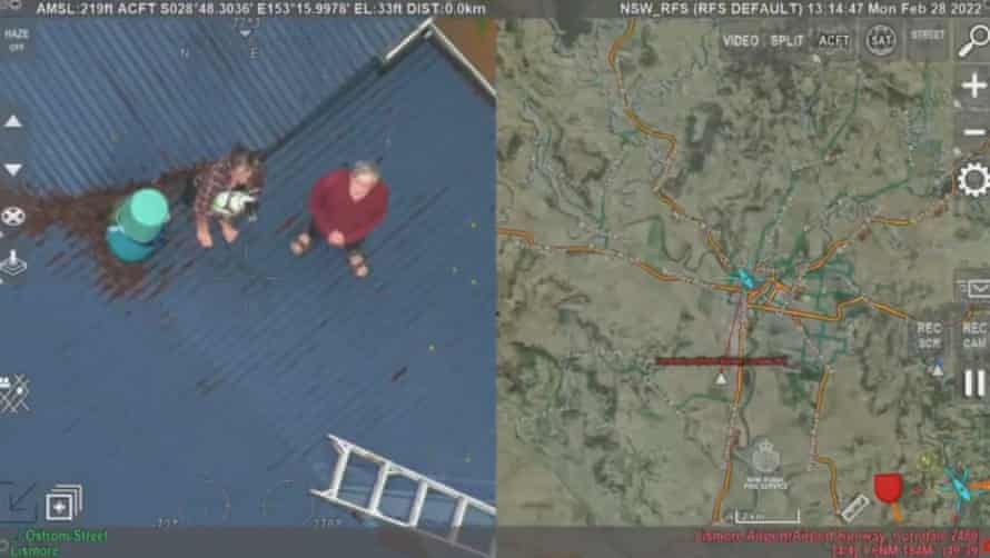 An image taken on 28 February shows two Lismore residents and their dog stranded on the roof of a home during major flooding.
